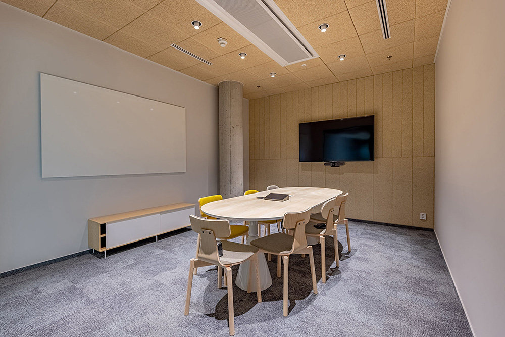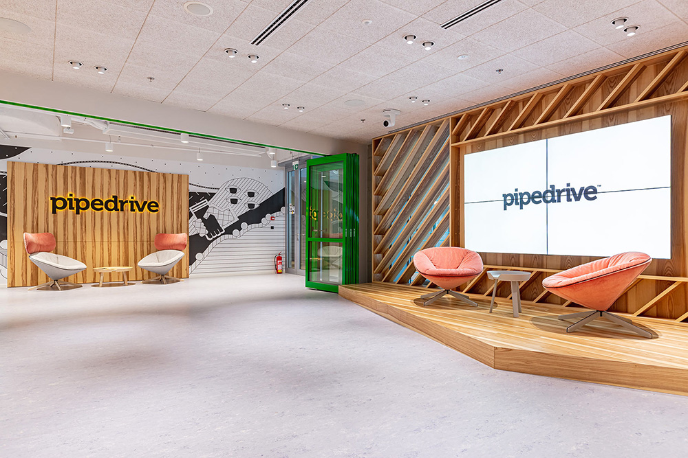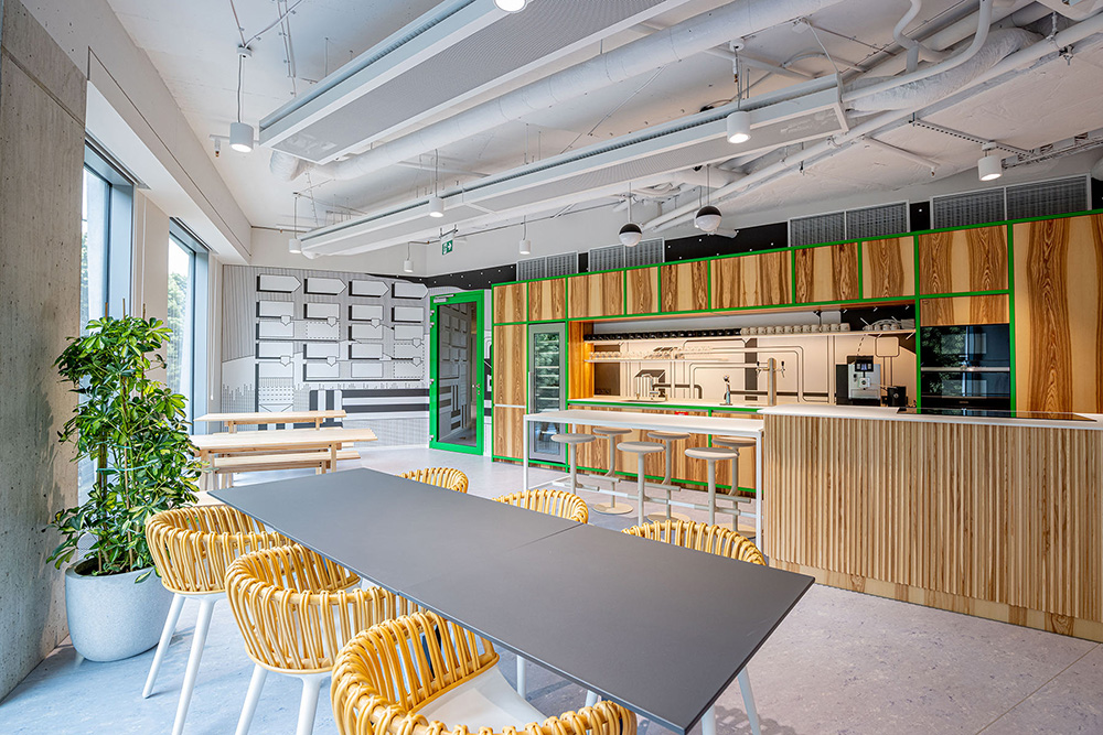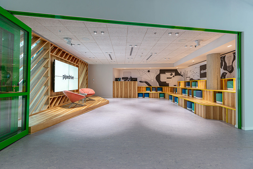会议室的设计灵感则来源于哈利波特的魔幻世界,在这里员工可以休闲的看着电视聊聊天或来一场游戏比赛,让疲惫的身心重焕活力。Pipedrive布拉格办公室的设计灵感得益于爱沙尼亚文化以及科创企业的文化精神。设计根据企业色彩标识系统,采用绿色和黑色元素来装点室内空间。#空间装修设计#