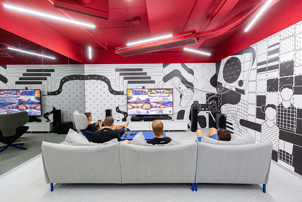 办公室设计装修:在这里员工可以休闲的看着电视聊聊天或来一场游戏比赛,让疲惫的身心重焕活力