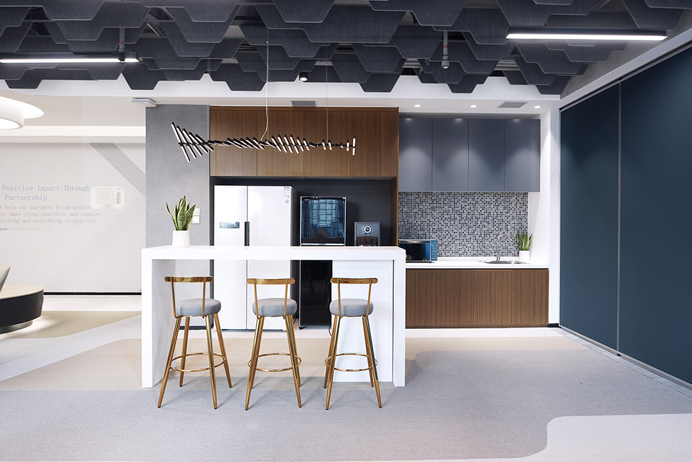 地面的BOLON编织地毯呈鳞片状铺装,随着光线和视角的改变呈现出绚烂的色彩;家具的围合形成不同的组团:茶歇、浅谈、简餐、阅读,游戏……。虽然置身万象天地腹地,其中休闲餐饮选择不胜枚举,但是店家再有诱惑的茶点也抵不过享用一杯自己亲手调制的咖啡感觉惬意……家的归属感难以抵挡。#办公室室内设计#