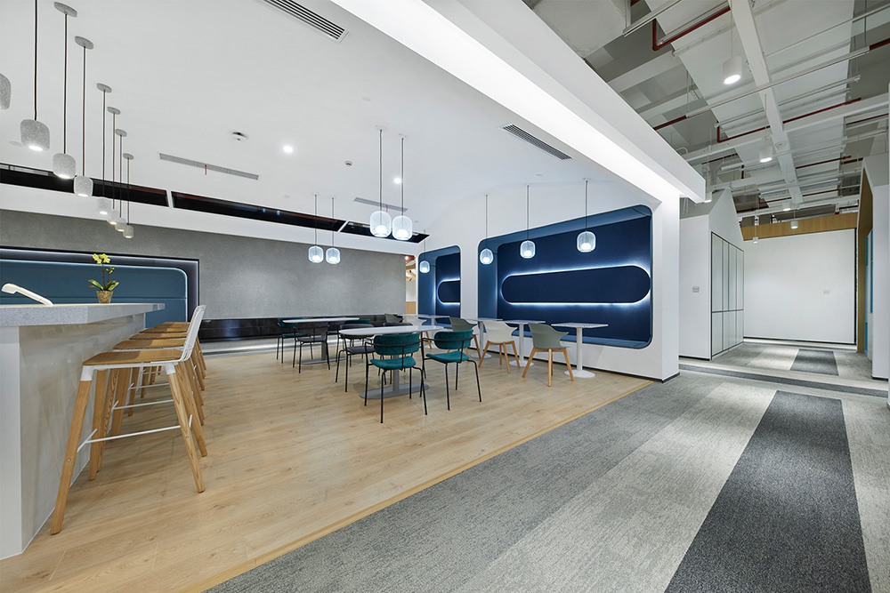 左侧沙发区色彩跳跃和一旁的黑马装置让人们卸下了“严肃”、放松了心情,也能感受到这家企业的轻松与包容。放射状灯带延续至空间四周极具视觉冲击力,动静结合、张弛有度,传达着空间的动感和大气。也强烈释放着研发企业自信的特质。#空间设计案例#