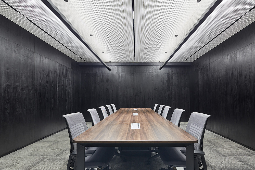 打破传统办公单一拘谨的氛围,利用轻盈、自然的材质,满足参观者和使用者的不同需求,彰显企业精神与文化归属。进入前厅,黑色造型背景墙与白色亚克力接待台将视野带入整个空间,采用隔而不断的方法打造空间的围合形式,制造空间视觉通透感。仿生水景与轻质格栅呼应,形成流动的倒影,拓宽了空间的立体维度,打破了单一的界面语言。富有变化的网格造型让前厅于虚实之间自如转换,黑白相间,独具艺术视觉体验。#写字楼设计装修#