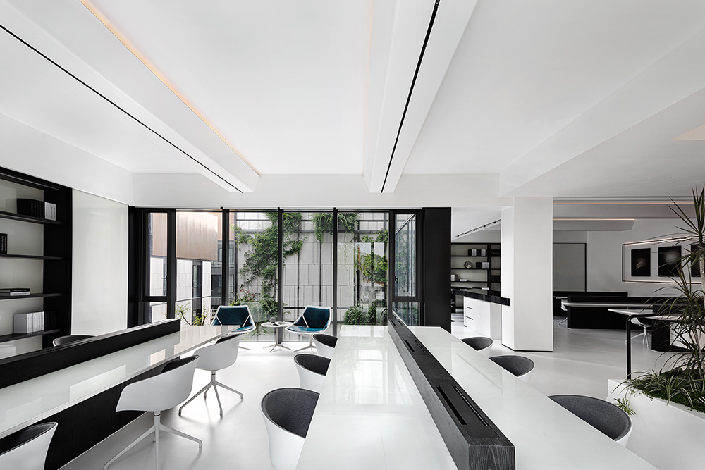 “晚风庭院落梅初。淡云来往月疏疏?!笨占湟嬗谕ピ旱木肮酆筒晒?,获得了一种惬意舒适的办公心境。不同的楼层位置皆可见庭院鲜活的景观,自然哲学渗透在日常忙碌的工作中,对于四季的感知拉近了人与真实环境的联系。#空间设计案例#