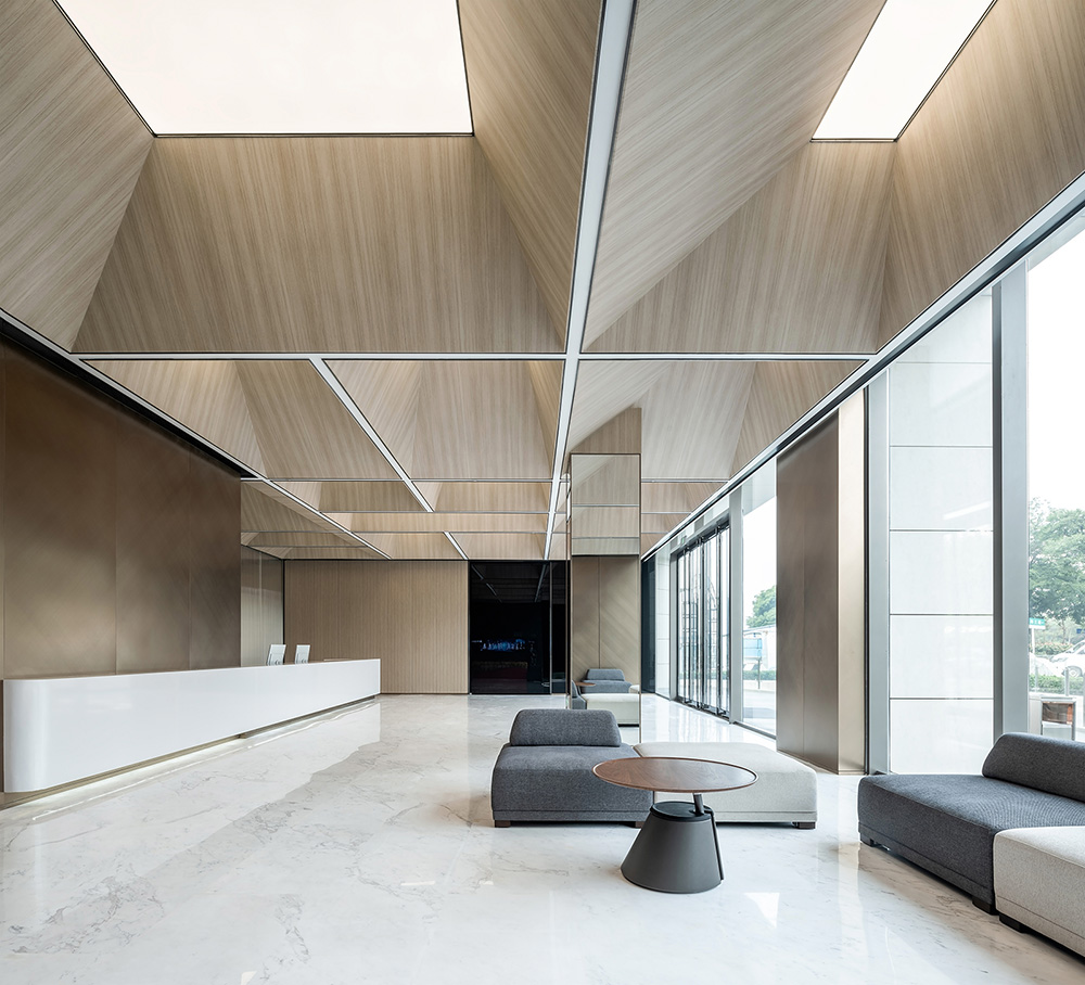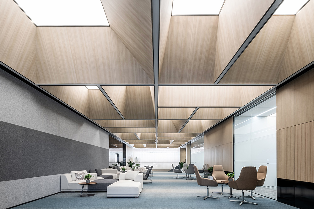 通过审视空间条件,思考空间顶部及整体标高的设计。结合现场复杂的梁归纳设备贴梁走管,形成不规则方块形。通过发光膜模拟天光效果,营造沐浴“阳光”下办公空间氛围感。重新思考现代工作的场景。打造的不是像咖啡馆那样一待就很久的空间,而是一个有更多活动和交流、更加积极主动、使人们自然而然地受到更多协作方式。#空间设计装修#