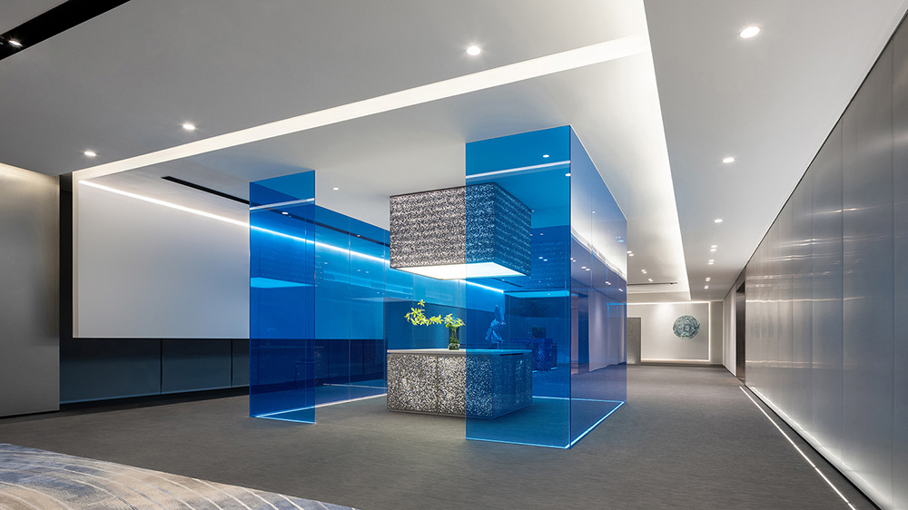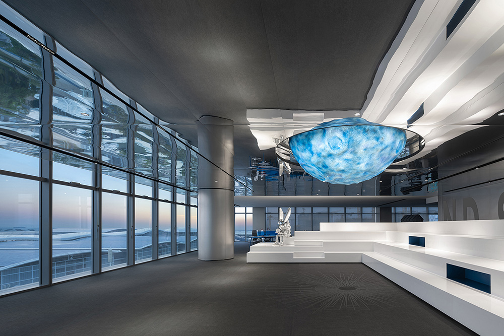 在这片面向未来和世界的窗口之地,会展湾里岸是少有的、占据稀缺资源和优越地段的封面办公产品。甲方希望人们直观感受产品优势,并为此选择了景观面最好的朝向。连天接海的会展湾一望无垠,全球最大会展中心蓝紫色的海浪型屋面上,彩色丝带蜿蜒其中,像一条为怀抱梦想的人们铺就的海上丝路,当步入展示空间,如此恢弘的景象便闯入他们的眼睛。#空间设计案例#