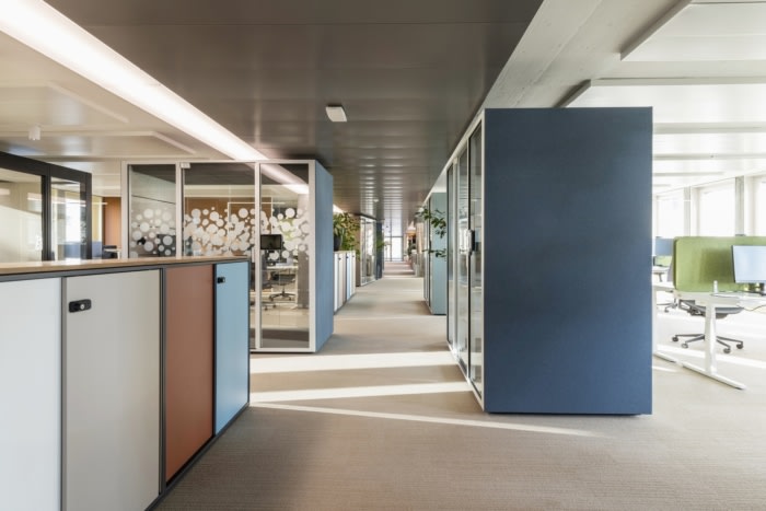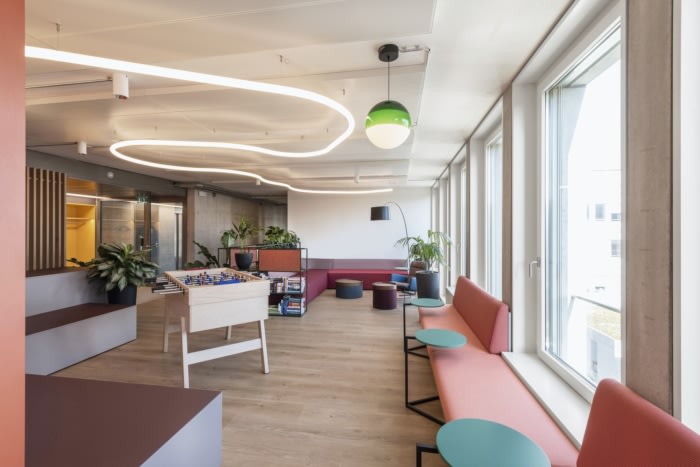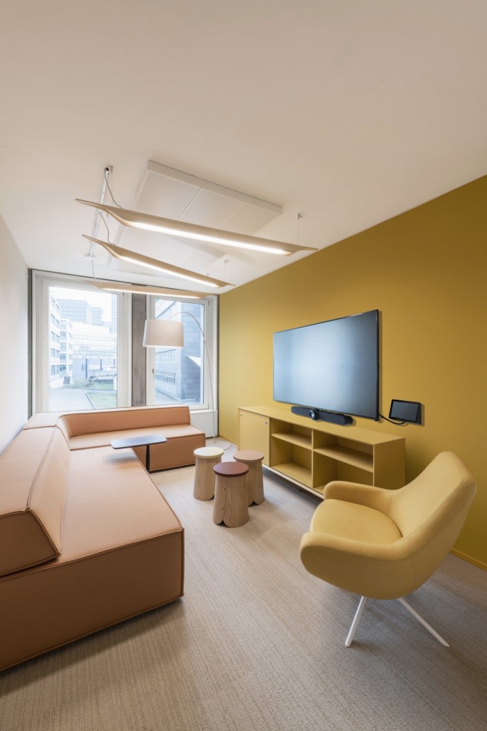 为了满足在线视频通话和噪音敏感度的需求,每层楼都点缀着声学室和房间,以便集中工作。每间安静的工作室都采用描绘联合国教科文组织世界遗产的落地墙图形,实现了个性化设计。丰富的室内植物增添了额外的平静感并提高生产力。#办公楼装修#