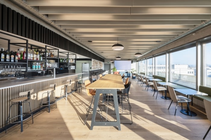 另一个充满活力的咖啡点位于四楼。它通过内部楼梯与上下楼层相连,是员工在有趣、活泼的氛围中喝杯咖啡、吃午餐或举行非正式会议的汇合点。最大的枢纽位于顶层。该中心采用对比鲜明的浅色和深色木制元素、休闲家具和配备啤酒龙头的定制吧台设计,旨在类似于市中心的鸡尾酒酒廊,员工和客人可以在下班后见面并一起享用饮品。#广州办公楼装修公司#