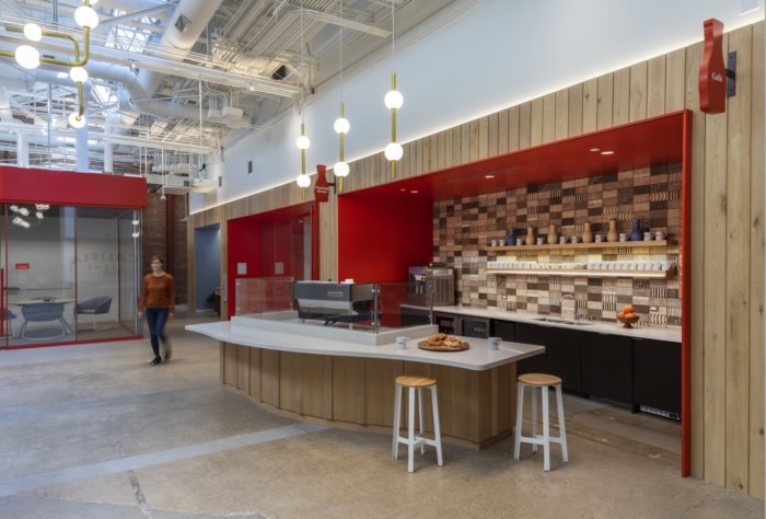 在内部,员工和客人都会受到一家咖啡馆的欢迎,咖啡馆设有酒吧和专门的内部咖啡师——在新的办公室环境中,他类似于有福利的接待员——制作各种咖啡和浓缩咖啡饮料,更不用说软冰淇淋了,所有这些都自然而然地配上加州的植物性牛奶和奶油。#办公室装修公司#