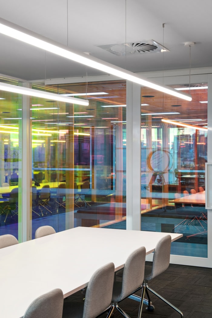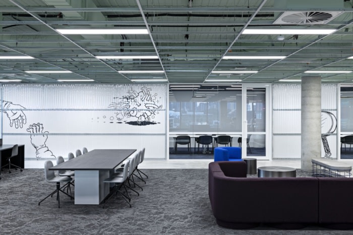 这体现在开放式设计方法中,建筑形式极简,鼓励空间中的连接和偶然时刻。最终的设计几乎没有边界,通过材料性、自然光和空间中的有机运动连接起来,统一了这一连接的核心元素。光泽材料与柔和大胆的色调内饰和细木工制品相平衡,二色窗膜作为浮动会议室块,由半透明的波纹板平衡,框架壁画。#办公室装修设计案例#