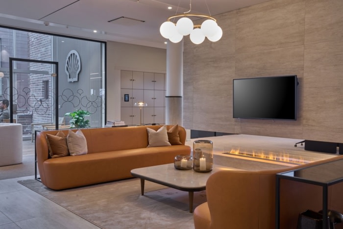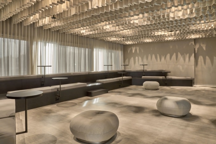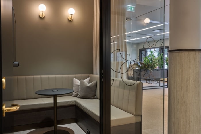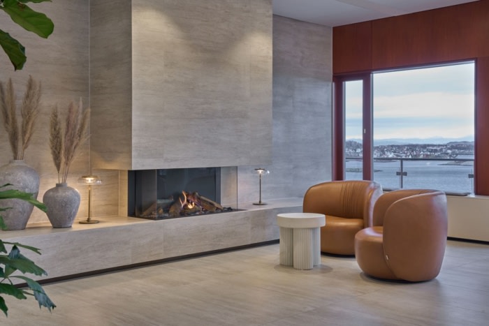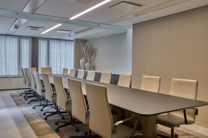 建筑中的主要材料是石灰华,桃花心木和拉丝哑光青铜。石灰华具有分层纹理,可以与储层中的层进行比较。作为简报的一部分,必须保留旧的东西并产生新的东西。在新总部,最好保留原始建筑中的桃花心木。桃花心木与新的石灰华和青铜的使用一起给人一种温暖而现代的表达。红色和绿色缟玛瑙的细节赋予了室内特色和强烈的身份。颜色是温暖的,从金粉色到沙色和烧焦的橙红色调,营造出舒适的氛围。颜色灵感来自扇贝的色调。#办公室装修公司#