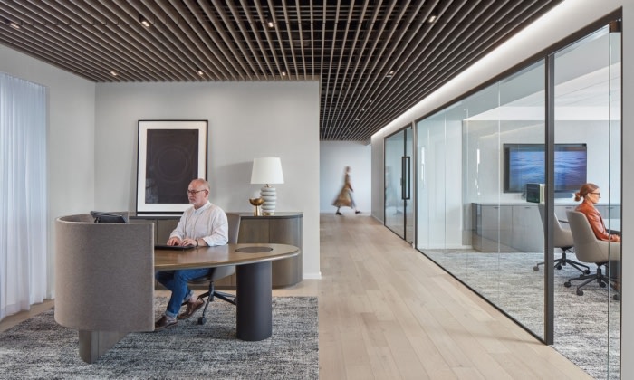 律师的混合工作安排导致了具有相同家具和有限存储空间的通用大小的办公室。技术的重要性日益增加,导致视频会议工具在每个律师办公室以及每个会议室中无缝集成。所有这些功能方面都以住宅风格的斯堪的纳维亚美学呈现,同时时尚而温暖。#办公室装修案例#