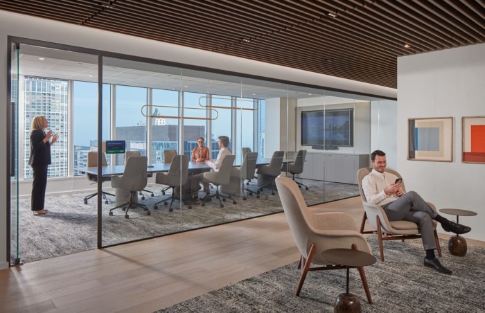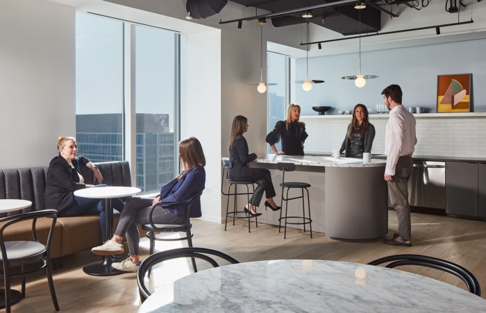 专注于将访客带入办公室,因此扩大了会议中心,拥有温暖、温馨的装饰,并享有芝加哥天际线和密歇根湖远处的广阔景色。经过两年的远程工作,需要建立和扩展工作场所文化,因此扩大了咖啡馆,可以获得最佳景观。#办公室装修公司#