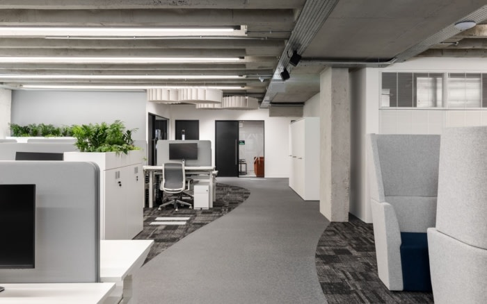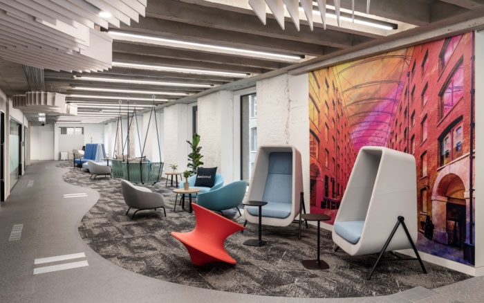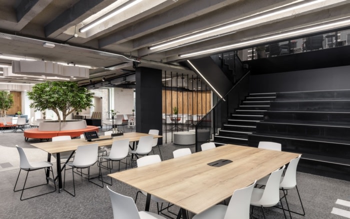 多功能空间可从两层楼轻松到达,可用于日常午餐和休息,或举办公司范围内的活动,例如季度全球演示。进一步的伦敦特色被注入到空间中,室内树木被长椅包围,这是对伦敦标志性公园的致敬,这些公园是这座城市的特色。#办公楼装修公司#
