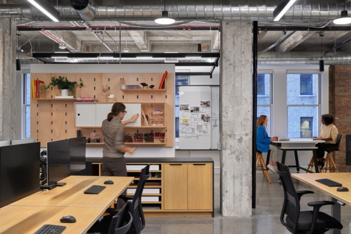 通过根据健康安全问题重新考虑办公用品,确定每个人都需要专用的键盘、鼠标和耳机。这促使我们设计了一种存储解决方案,将个人托盘放在入口附近,作为特定日期在工作室的人的即兴仪表板。通过个人选择、灵活性、连接和必要的系统来方便使用,设计师在工作室中提供了与家庭环境所能提供的有意义的体验截然不同的体验。#办公室装修公司哪家强#