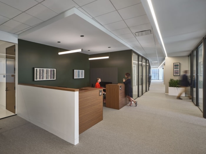 材料代表自己,通过其美丽、诚实和触感吸引用户。柔和的边缘、曲线几何形状和线性元素并置,创造了一个专业而诱人、平易近人但可靠、敏捷但专注、微妙优雅但大胆的定制工作场所。#办公室空间设计装修公司#
