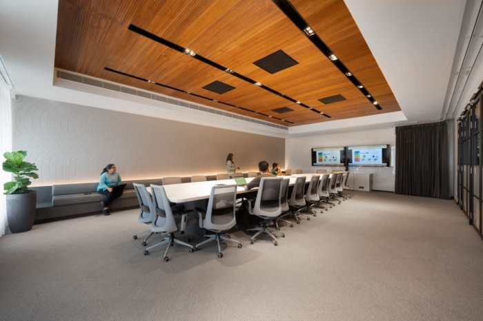 其他定制元素包括“波纹”雕刻的3D隔音墙板,温暖的木质接待台,微妙地向标志致敬,以及当地编织的梅花色调的羊毛地毯。除了美丽的元素之外,这是一个方便且灵活的工作场所,为其 300 多名员工日夜运营。#办公室空间设计公司#