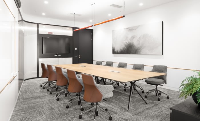 项目位于布加勒斯特的一栋办公楼内,分为两层:另一层是公共的,设有接待区和会议室,另一层是私人的,仅供员工使用。公共地板的总体外观和感觉的特点是优雅的中性色调,玻璃隔断中的有机形状,地板地毯纹理,甚至定制的家具和灯具。#办公室空间设计案例#