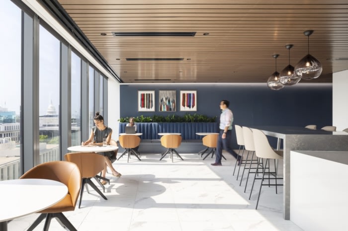 为了营造一种平静和专注的氛围,企业倾向于简洁的线条和冷色调,并在整个色调中流行色彩。落地窗为整个公共区域和会议室提供充足的自然光线,可直接欣赏国会大厦和更广泛的 DC 天际线。通过内置搁板、公共长椅座位和彩色玻璃墙创造了发现和互动的时刻,在员工和访客在整个办公室中移动时与他们互动。#办公室装修设计公司#