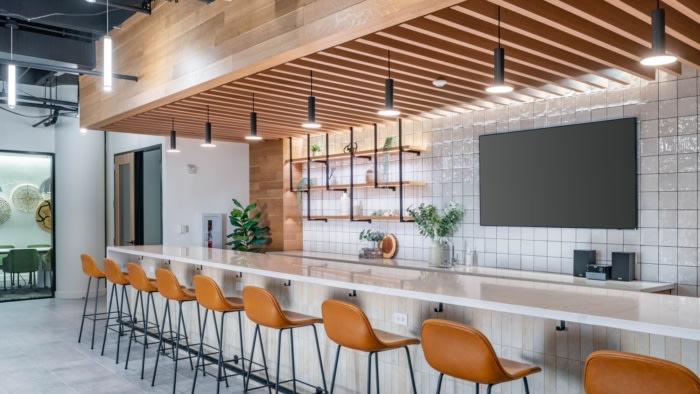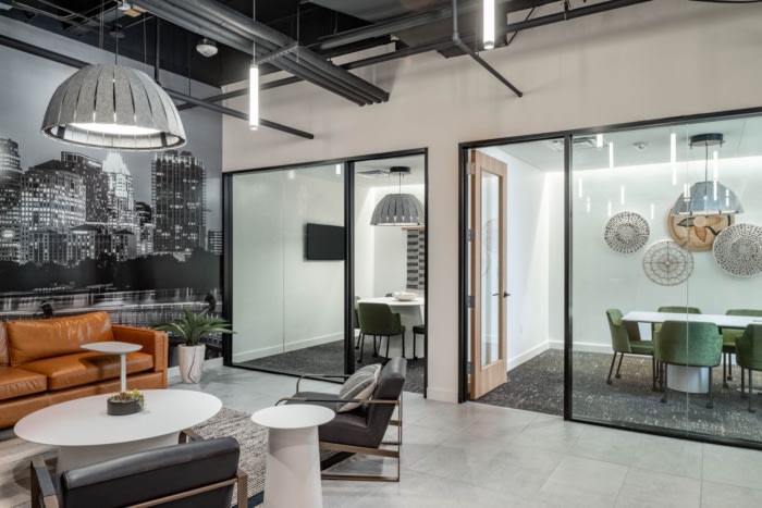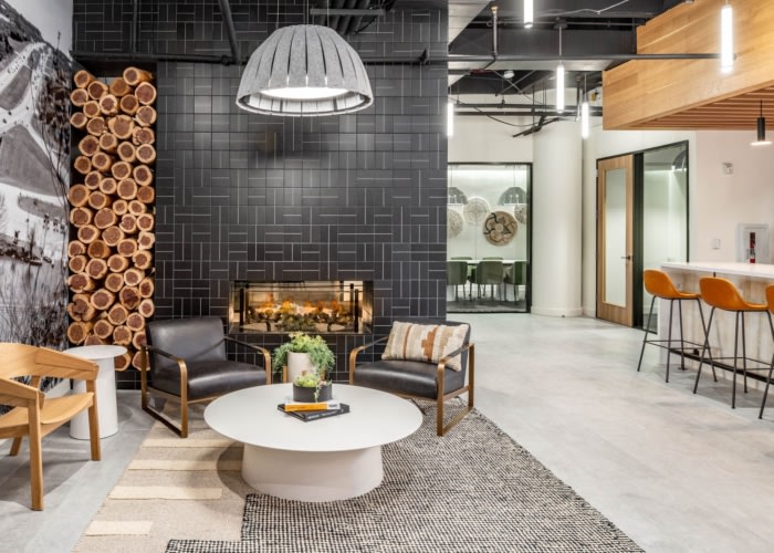该设计进一步丰富了温暖的室内纹理和图案,包括当地采购的艺术品、定制城市壁画和独特的水蒸气壁炉??占涞乃薪锹涠季谋嘀谝黄穑丛炝艘桓稣寤肪?,在办公楼内培养创造力、生产力和社区感。#办公室装修设计案例#
