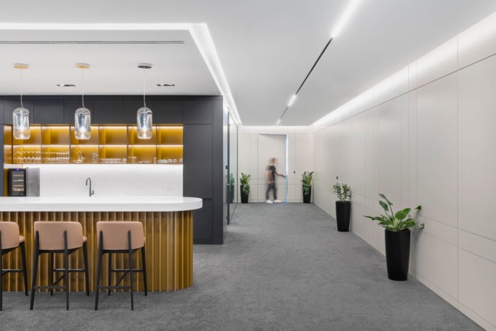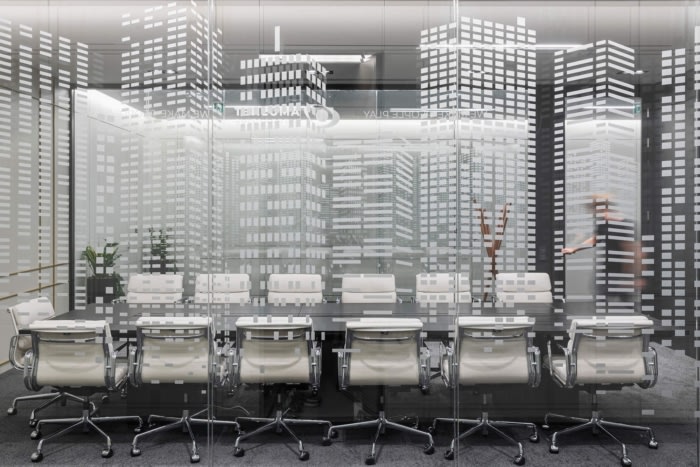 这个办公空间的照明设计证明了“少即是多”的原则。极简主义的灯具轻轻地照亮该区域,投射出柔和的光芒,增强了整体氛围。无框门无缝地融入整个空间,进一步营造出时尚整洁的感觉,唤起一种独特的精致感。当您的目光在开阔、温馨的区域徘徊时,您的注意力立即被吸引到中心焦点——一座宏伟的大理石石吧台上。其光滑的表面散发着永恒的美感,是同事和访客的聚集地。酒吧与酒吧无缝衔接的是一间位于中央的会议室,采用黑白色调。#公司办公室设计装修案例#