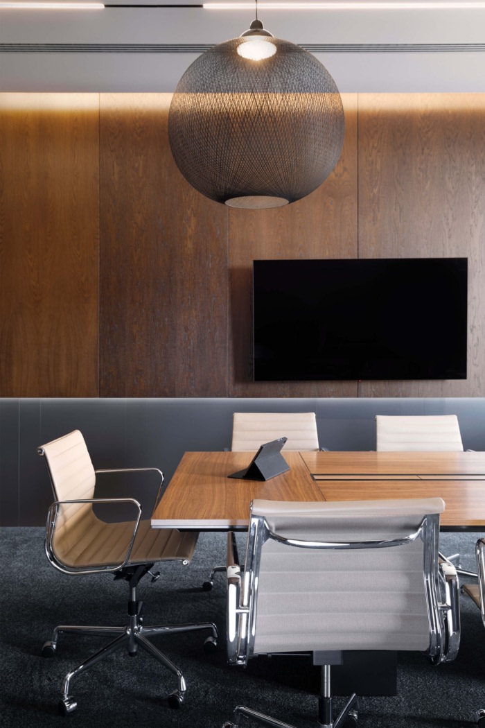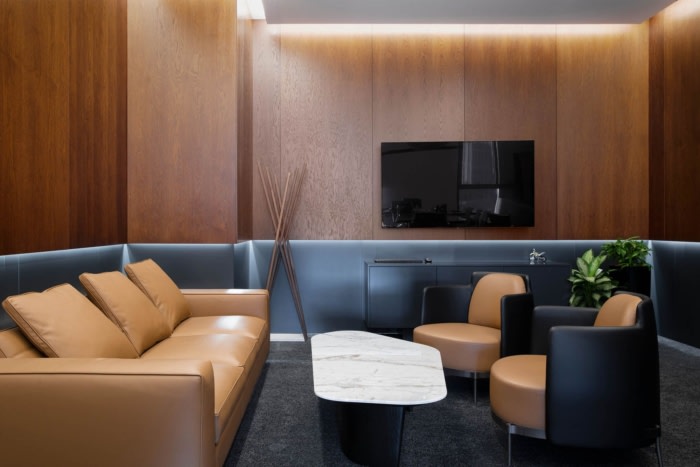 办公室设计装修案例:温暖的口音通过奢华的皮革和抛光木材高雅地引入