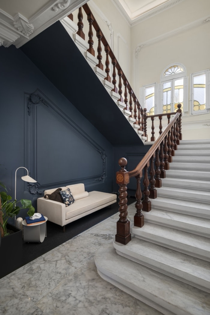 公司办公楼装修:用深蓝色和翠绿的颜色清洗墙壁 大胆地宣布建筑物上升到当代