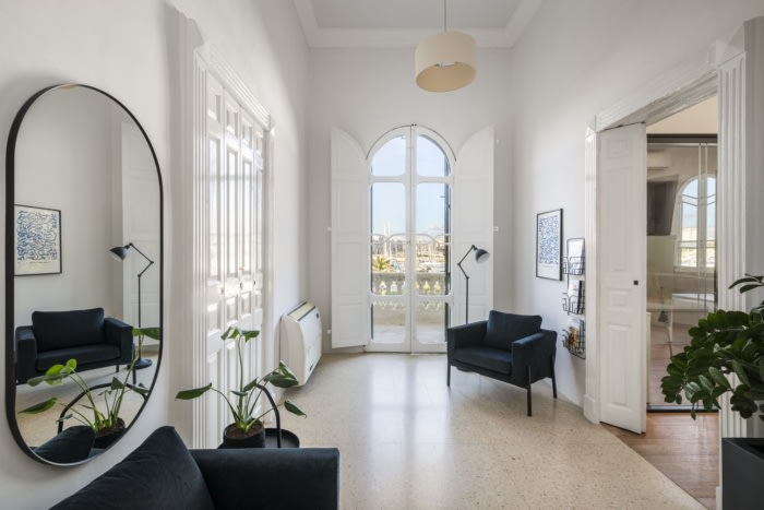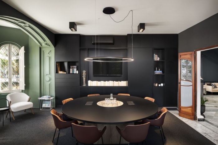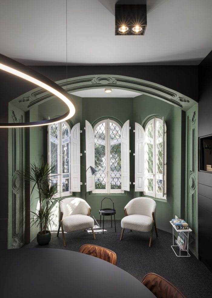 微妙的灯具、单色墙壁和最小的家具的组合被用来增强现有的功能。用深蓝色和翠绿的颜色清洗墙壁,大胆地宣布建筑物上升到当代,而电力服务的路线则谨慎合理化,以便为未来的租户保留建筑物的建筑地板,墙壁和天花板。这是通过在阳光普照的会议室中使用高架地板来实现的,随后使房间进一步与众不同,补充了精心修复的凸窗。#办公楼装修案例#