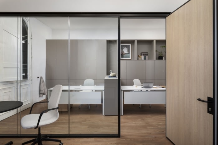 更雄心勃勃的是,在建筑引人注目的门厅内组成的半圆形接待处模仿了其上方的弯曲特征,将其确立为焦点,并允许从花盆到接待台的电气连接不显眼地运行。一楼的玻璃隔断允许用户阅读现有房间内固有的建筑比例和节奏,同时为现代办公室提供必要的隐私。#公司办公楼装修案例#