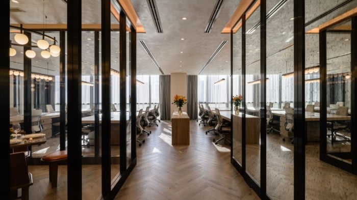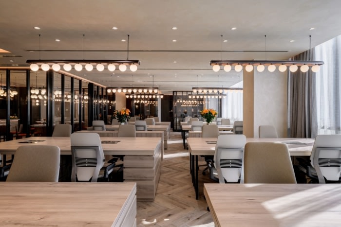 对细节的关注使后台与众不同。每张办公桌均配有独特的吊灯,确保个人工作站有充足的照明。乳白色的墙壁和天花板,装饰有特殊的油漆饰面,营造出清新舒适的氛围。浅色的木质办公桌与装饰相得益彰,而空间中心的插花则注入了风格和生活方式的元素。#广州办公室装修设计公司#