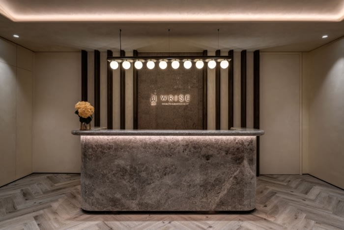办公室的接待区采用人字形图案地板,米色手绘墙壁和天花板,以及灵感来自公司品牌主题的闪闪发光的墙纸。一个简单的弧形大理石柜台位于空间中间,欢迎客户和访客。#办公室装修#