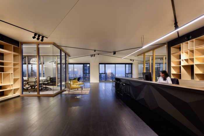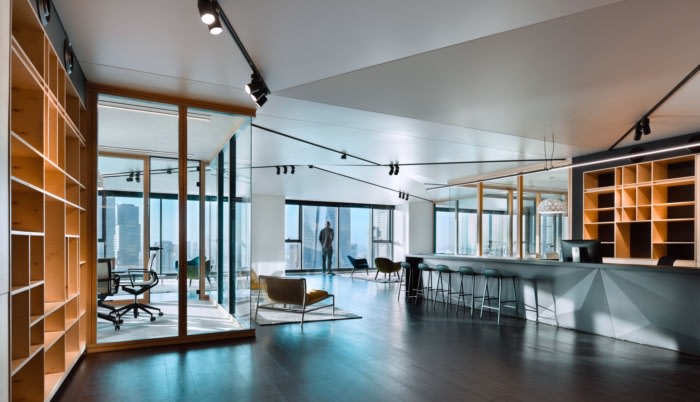 休息区分散在空间中,位于钥匙附近。虽然倾向于将会议室或办公室放置在巨大的店面附近,但建筑师能够创建低座位区,并在内部的相邻空间中创建透明的会议室,每个会议室都住在那里欣赏特拉维夫充满活力的城市景观。休息区不会遮挡坐在不同房间的人的视野。#办公室装修设计公司#