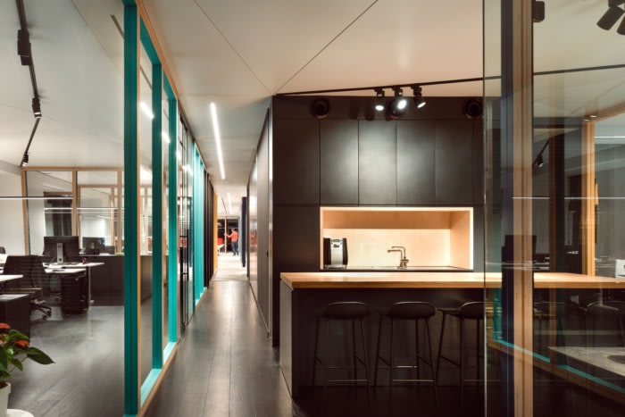 办公空间没有不必要的设计,干净简约,与折纸天花板相协调。地板选择了黑色鱼骨镶木地板?;嵋槭沂褂媚局聘舭?,有助于办公室的独特外观,并为其增添略有不同的方面,为空间带来温暖和俏皮。隔断本身也具有极简主义的设计,每个房间的特点是不同颜色的隔板。#办公室装修设计案例#