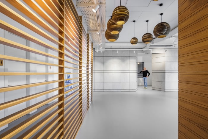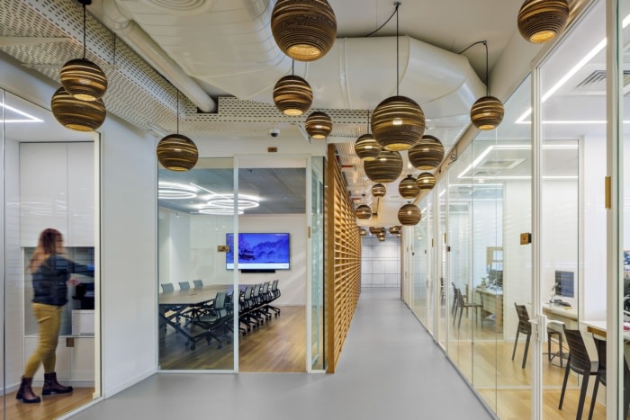 日本的参考是微妙的,通过材料的选择、几何图案的发挥和手工制作的木制品细节来呈现。东西方之间的对话继续着,精选量身定制的木制家具,以及200盏由编织纸板制成的标志性吊灯,像亲密的日本灯笼一样悬挂在整个办公走廊上。#办公室装修设计#