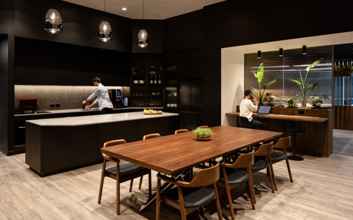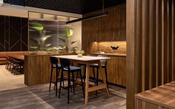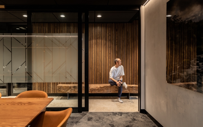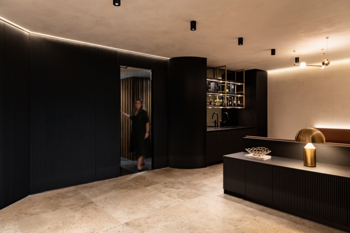 进入后,迎接游客的是装饰有艺术品的落地定制细木工单元,并由特色照明优雅地照亮。舒适的休息区就在拐角处,小厨房的灵感来自威士忌吧,并由嵌入式环境灯柔和地照明。到达空间经过精心设计,采用宽大的黑色沟槽镶板,隐藏了三个谨慎的门口,邀请客人进一步探索。#办公室设计装修公司#