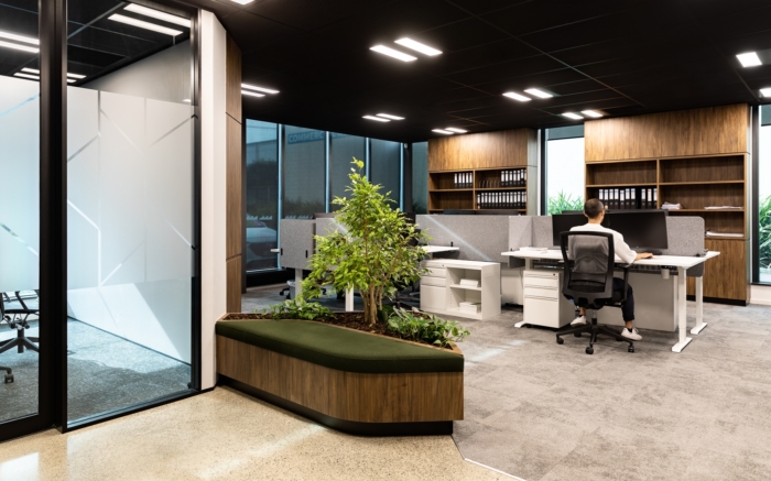 从品牌在建筑行业的强大影响力和建筑物的非凡建筑特色(例如醒目的黑色网格天花板)中汲取灵感,设计概念诞生了。该设计喜怒无常、难以捉摸和精致,通过巧妙地使用黑色沟槽镶板、温暖的胡桃木木材、环境照明和无可挑剔的细木工单元来实现这一目标,并点缀着黄铜装饰。每个关键区域都向这些元素致敬,从入口区域开始。#办公室设计装修案例#