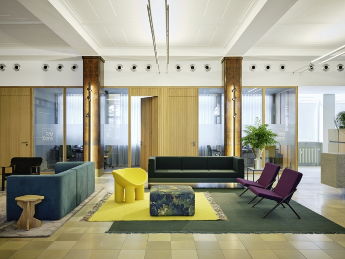 在社交方面,房间呈现为一个舒适的客厅,前面有一个温馨的咖啡馆,邀请客人流连忘返,有宾至如归的感觉。特别是,包容性设计旨在吸引客人,例如老年人,现代数字银行可能会感到没有人情味和疏远。在形式上,该设计引入了新的建筑“箱中箱”,这些箱子位于修复后的银行大厅内,进行新旧对话。在物质上,该设计将新鲜的新材料与历史悠久的材料混合在一起——温暖的木材、闪亮的金属、腌制的木材、带有回收成分的水磨石——混合了历史悠久的石材地板、原始的深色木柱和一百年油漆层下发现的历史准确的颜色。#银行办公室装修案例#