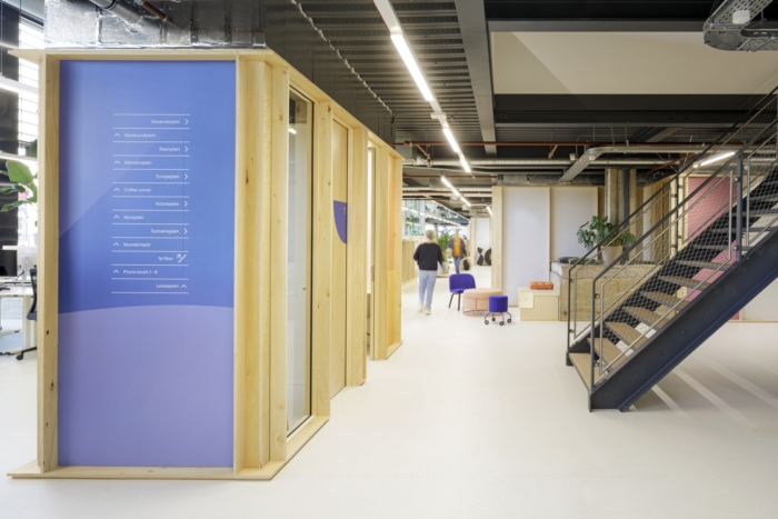 封闭的街区和公共家具由可持续的桦木胶合板肋骨制成。肋骨可以轻松扩展或划分空间,并提供新的视觉节奏。iO风格指南中的强调色和图案与当地艺术家的作品混合在一起,用于塑造封闭空间,非正式区域和标牌的内部。#办公室装修设计公司#