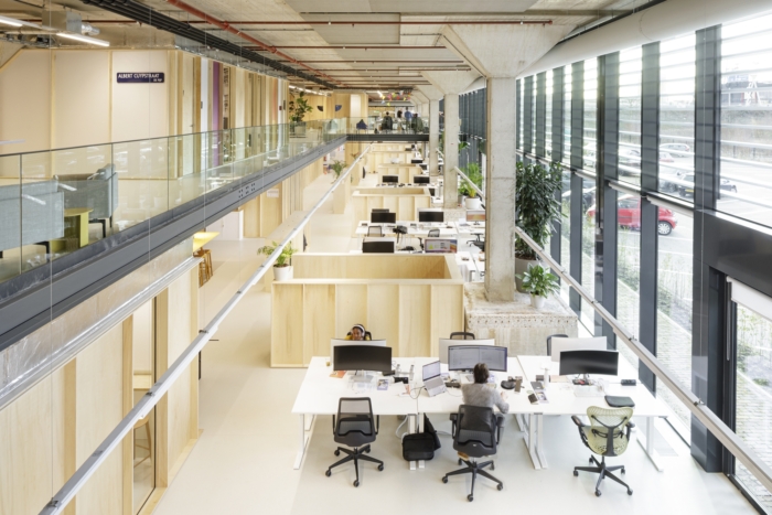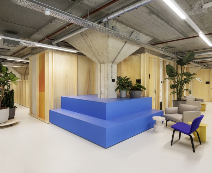 办公室装修设计:封闭的街区和公共家具由可持续的桦木胶合板肋骨制成