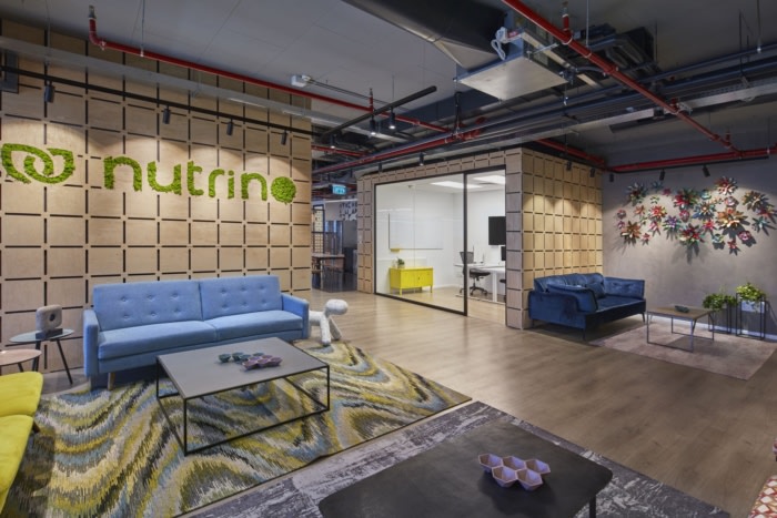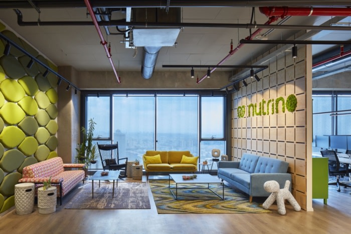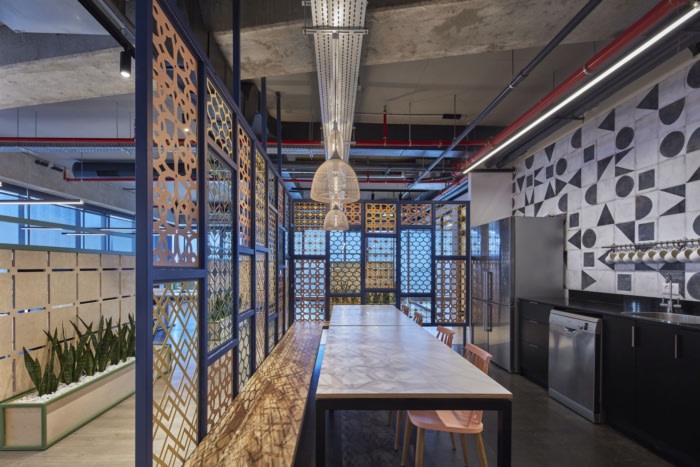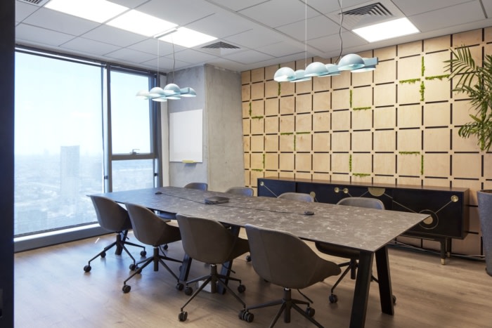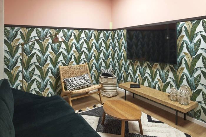设计师用湿漆石膏覆盖了办公区的大部分墙壁,这是一种天然干净的材料,是木制细节的成功背景。设计师创建了一个徽标的切口,并将其整合到由CNC切割的板条之间,绿色苔藓不需要维护,并且从构成公司名称的字母中生长出来。墙壁上装饰着植物印花墙纸,配以粉红色和绿色色调的物品以及藤条和稻草制成的家具细节,回归天然材料,营造出温馨轻松的氛围。#公司办公室装修设计案例#