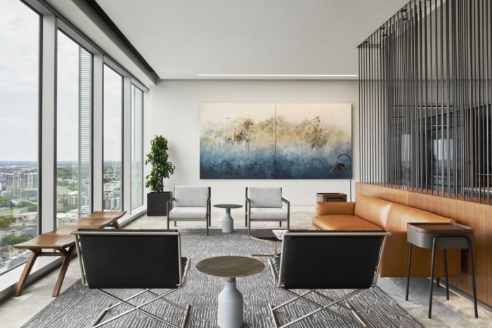 浅色天然石材地板和中等木纹与会议室和接待处的黑色钢元素形成鲜明对比。喜怒无常的纹理材料和温暖的灯光唤起了热情好客和娱乐的氛围。接待处、咖啡厅和会议层可直接通往俯瞰纳什维尔市中心的外部阳台,形成一个真正独特的娱乐空间?;嵋橹行墓灿?2 层,设有迎宾区和餐饮厨房。多功能室利用可操作的隔板来确保最大的功能。#办公室设计案例#
