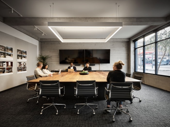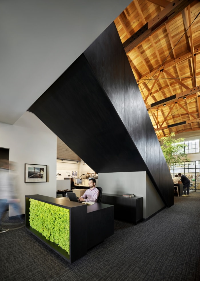 在内部,黑色、白色和强调灰色的调色板提供了一个现代、中性的背景,与木材和混凝土的历史饰面相协调。原来的建筑特征现在被揭示出来——喷砂天花板和桁架结构,以及木甲板——并与黑色的新个性楼梯并列。楼梯与入口大厅和树木固定的中央聚会区位于轴线上,与俯瞰福尔瑟姆街的夹层相连,并设有一面窗户墙,提供平衡的日光和下方街道的景色。同一轴线的一侧,在一楼,是一个会议室和办公室咖啡厅,里面有由从原始建筑中回收的红木托梁制成的案例。#专业办公室装修公司#
