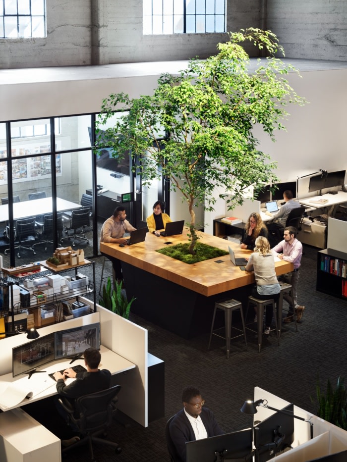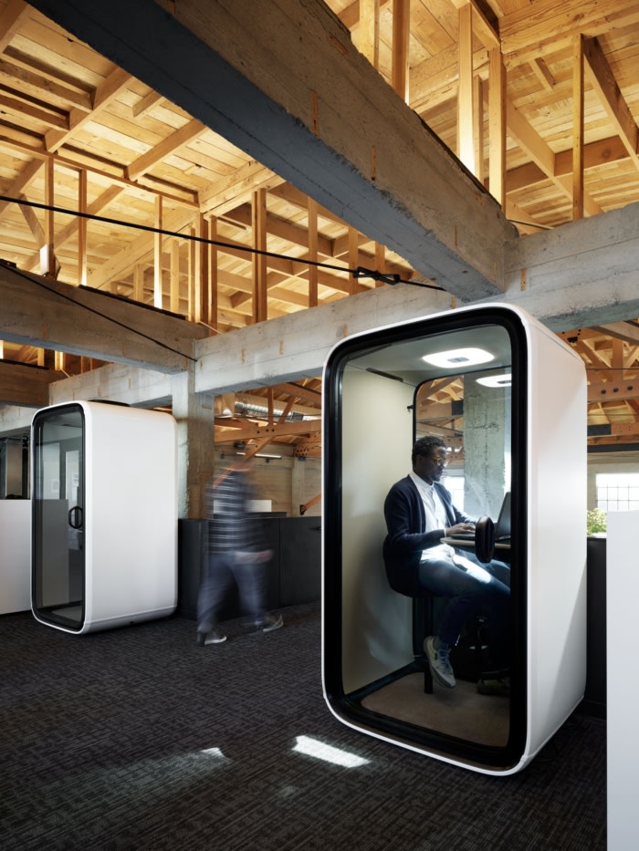 办公室装修:现代中性的背景与木材和混凝土的历史饰面相协调