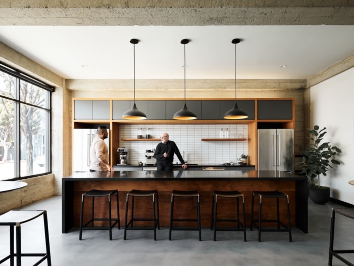 7200平方英尺的两层建筑工作室采用开放式平面图,包括聚会,工作和会议区域,健康和休息室以及与户外相连的后甲板,可通过大型卷帘门进入。在外部,拆除了一个简单的地板侧门,使立面恢复到原来的对称形式。#办公室装修实景案例#