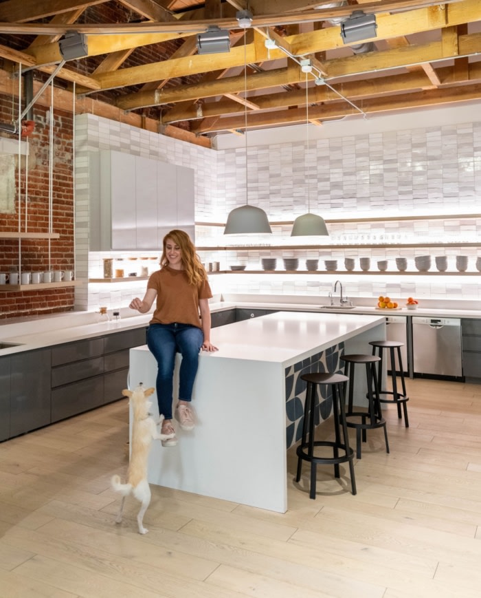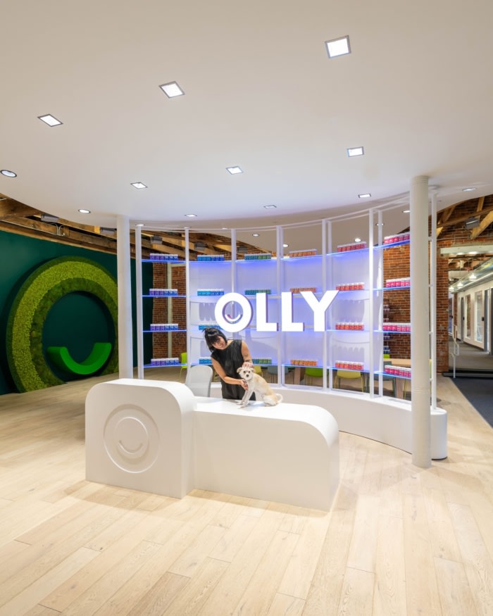 全白色的接待处和弯曲的展示墙类似于一个多合一的实验室和零售空间。接待处对微笑的企业标志以及公司独特瓶子的形状表示赞赏,表明他们已经正式进入该品牌。这种第一印象和体验有意发生在奥利营地的中心,就在明亮美丽的厨房旁边。大苔藓“O”位于野餐风格的“家庭餐桌”的头部,该公司聚集在这里享用多年来对他们的文化来说一直是神圣的日常午餐。#高端办公室设计案例#