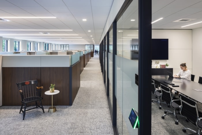 设计团队将传统设计语言与现代元素融合在一起,以周到而互补的方式使空间现代化。整个房间都使用了大理石和木材,并结合了黑色和黄铜装饰。现代灯具和家具增添了一丝精致感,尤其是在更倾向于公司传统情感的区域——例如行政套房,成型和内置是突出的特点。#办公室装修设计#