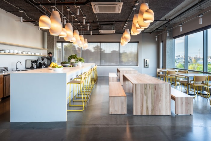 内部是开放式和私人办公空间的混合体。私人办公室、董事会议室、会议室和吊舱的墙壁上都衬有毛毡,以消音和增加个性,否则天花板会暴露在外并涂上深灰色的声学喷雾。选定的区域 - 大堂和董事会议室 - 采用枫木天花板,增加了额外的精致层并增强了声学性能。明亮的黄色元素贯穿整个办公室,以参考品牌标识并传达一种俏皮感。#公司办公室装修案例#
