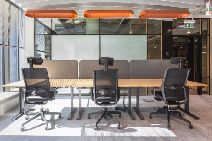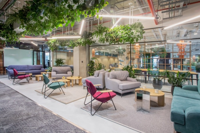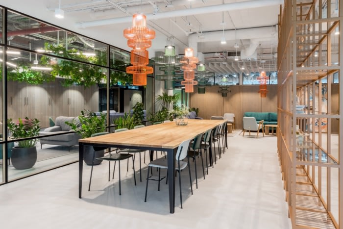 进入办公室内部的充足日光由安装的温度和照明强度控制系统提供支持,从而减少电力消耗。大量的绿色植物和专门设计的休闲区也支持了更好的员工福祉和效率。#专业办公室设计#