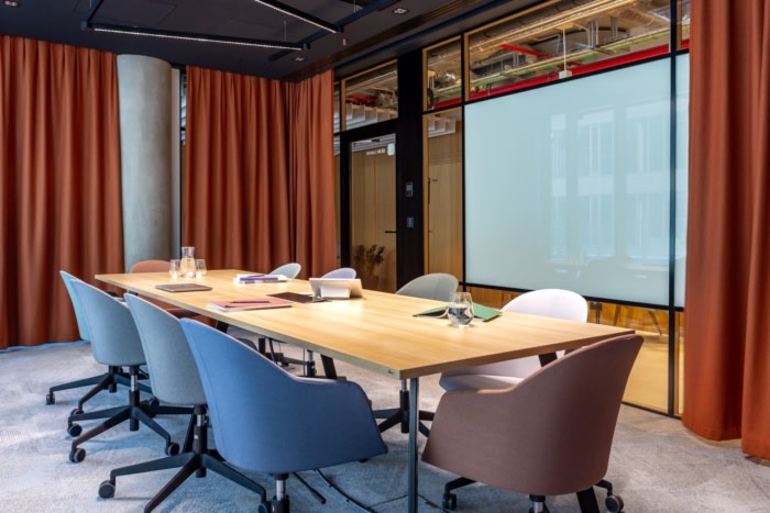 透明度是该项目的关键词,因此办公室以大量双层玻璃窗为主,这些双层玻璃窗装饰着单板形式的自然饰面,它们营造出空间和开放的印象。#办公室设计#