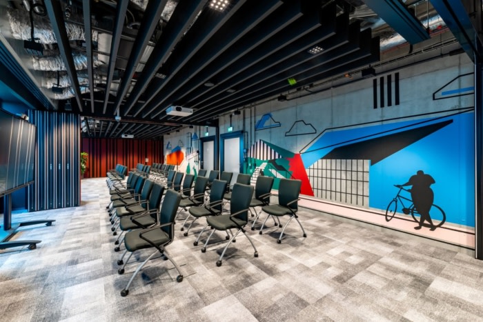 柔化工业室内的布置元素也在这里出现——各种颜色的软垫沙发、椅子和扶手椅?;褂行矶嗷钪参铮客ㄏ蛞桓隹沓ǖ穆短?,可以欣赏到卡托维兹的全景。根据颜色反转的原则,在同一楼层设计了健康室。这是唯一保持浅色自然色彩的空间。员工可以在这里练习瑜伽,或在工作日躺椅或悬挂式秋千茧上休息。#广州黄埔办公楼装修设计公司#