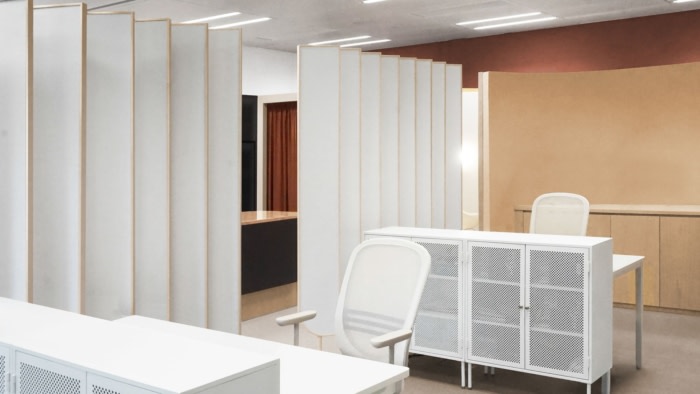 一个精致而开放的概念,工作办公区域由可调节百叶窗区域定义,根据需要倾斜,以创建一个有机的,不断变化的光线和声音过滤器,根据不断变化的偏好和光线条件做出流动性反应。#办公楼装修设计#