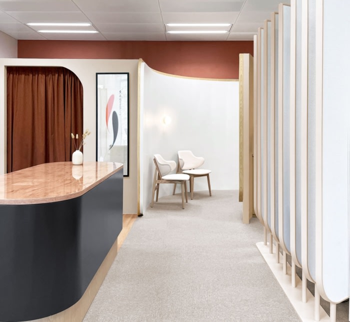 一片木质百叶窗环绕着空间的社会核心,为光线和声音建立了一个精致且高度可改革的过滤器。柔和的白色声学覆层朝外,形成明亮工作空间的背景,精心策划的家具和定制的雕塑作品营造出对比和平衡。正交形式被雕塑曲线和自然调色板的语言所抵消,为这个亲密而开放的社交领域带来精致和舒适的协同作用。#办公楼装修设计风格#